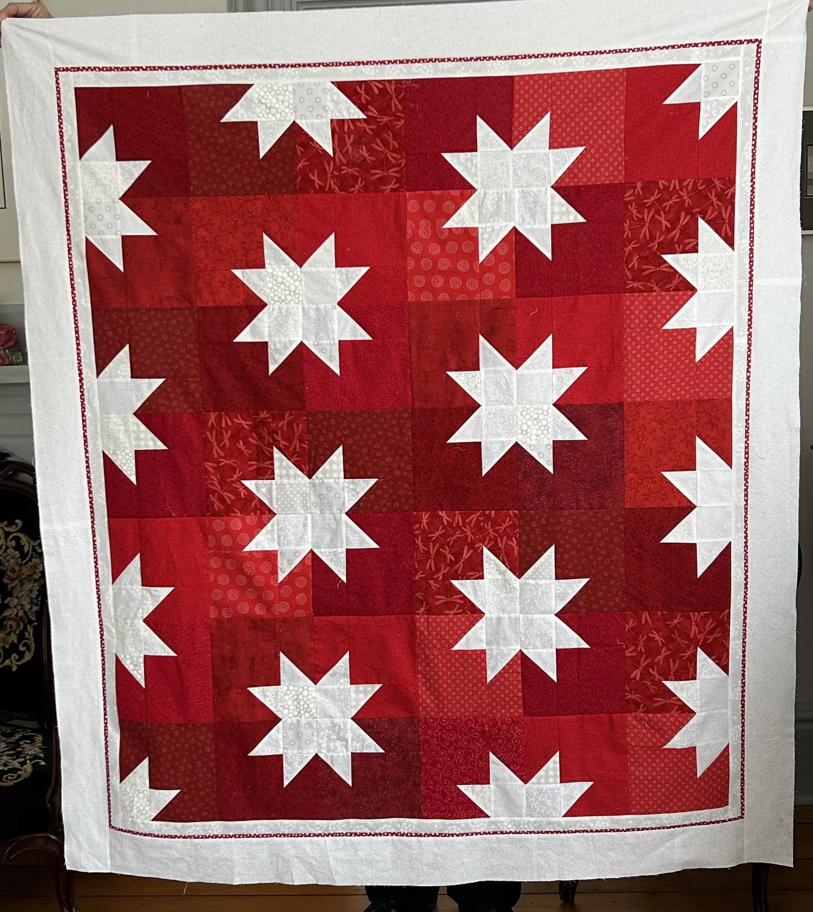 “Star Pop ll” needs to have the binding stitched (quilted by Nadine Stevens) and the red and white top is “Star Pop Two”, I am in the process of piecing a backing for it.