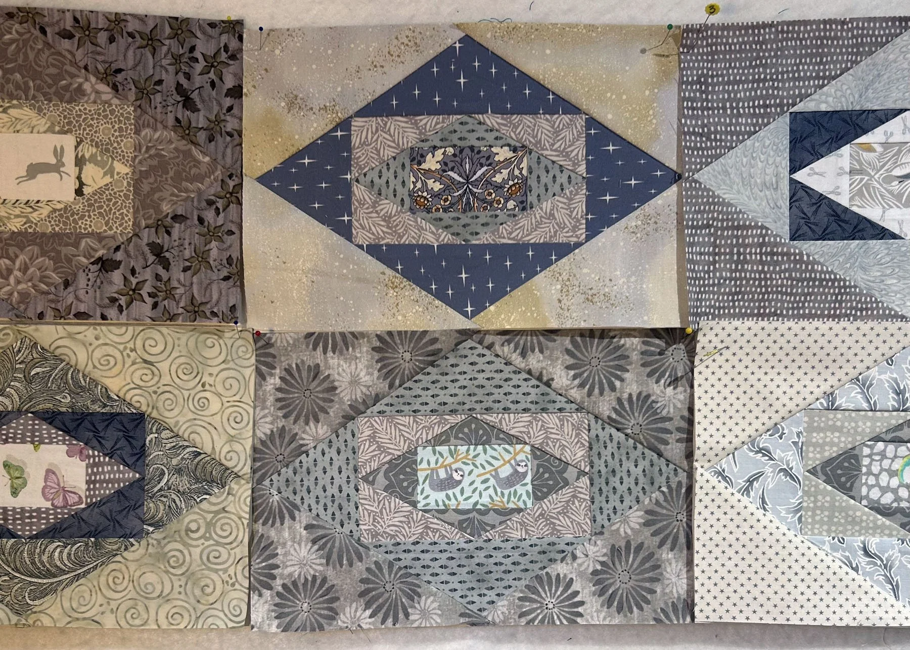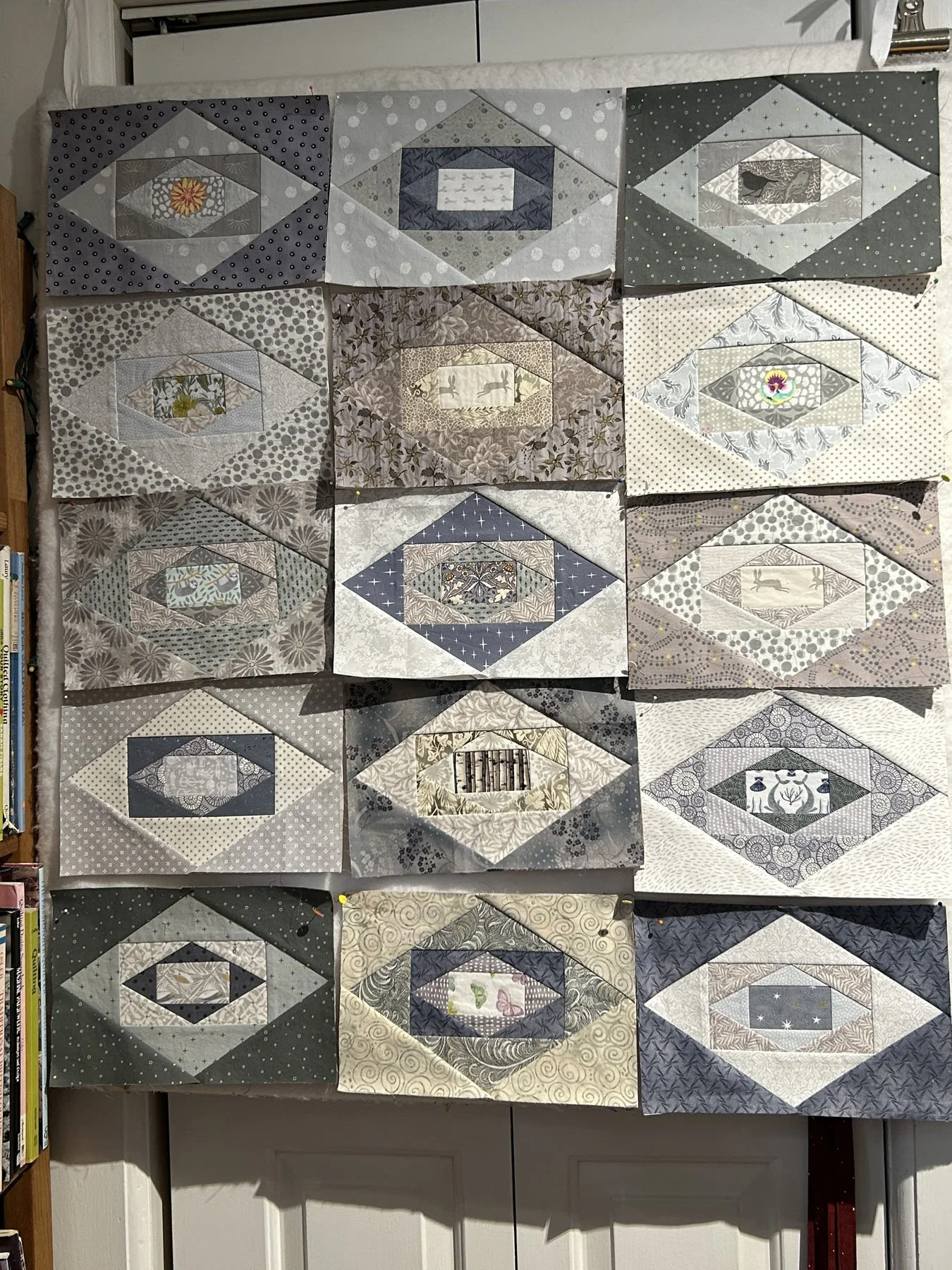 My works-in-progress include a smaller version of the “Wensleydale” quilt, I am calling it “A Gray Day in Wensleydale”, it is machine pieced and I am hand quilting it.